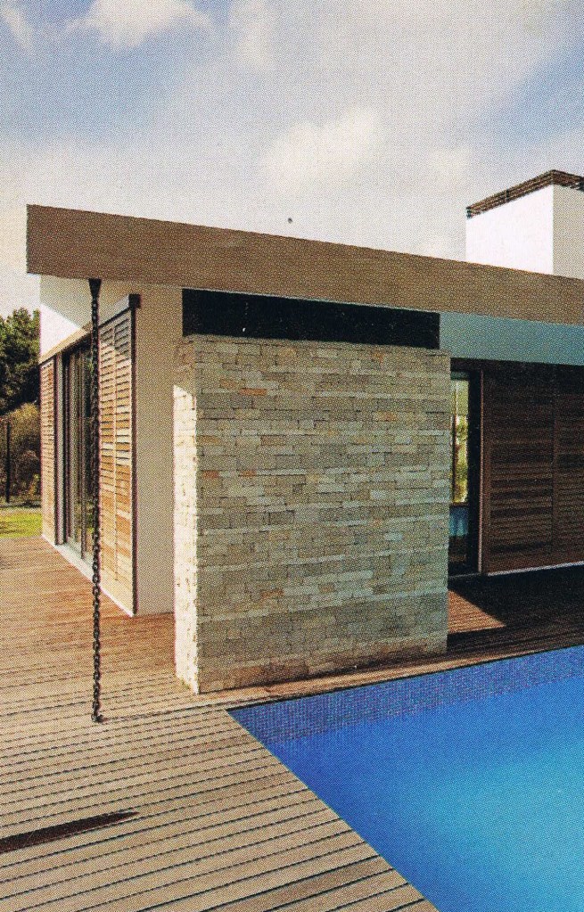 A casa de dois pisos, com linhas modernas, transmite uma ideia de elegância e requinte com os seus acabamentos de alta qualidade que incorporam os diversos elementos e texturas do exterior com o interior.